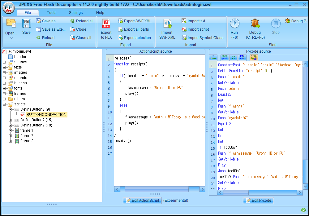 https://www.free-decompiler.com/flash/download/ 프로그램을 다운로드하여 admlogin.swf 파일을 열었다. ID/PW을 확인할 수 있다.