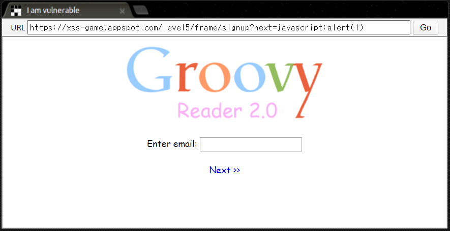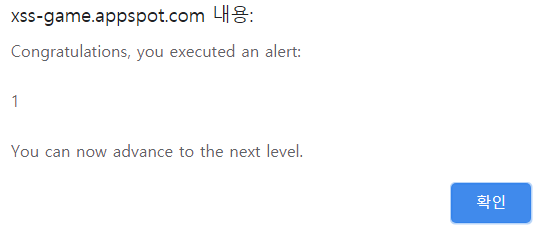 Go 버튼 누른 후 Next 버튼 클릭 시 XSS 공격이 동작되고 정답이라는 것을 알 수 있다.