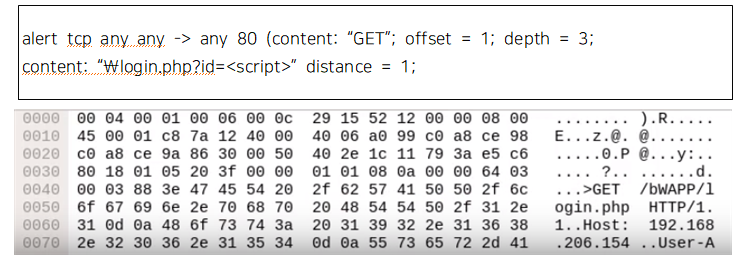 2) 'content:"/login.php?p=<script>": distance:1;' 구문의 의미
