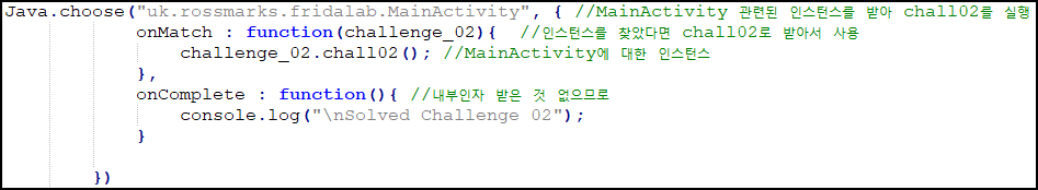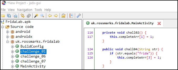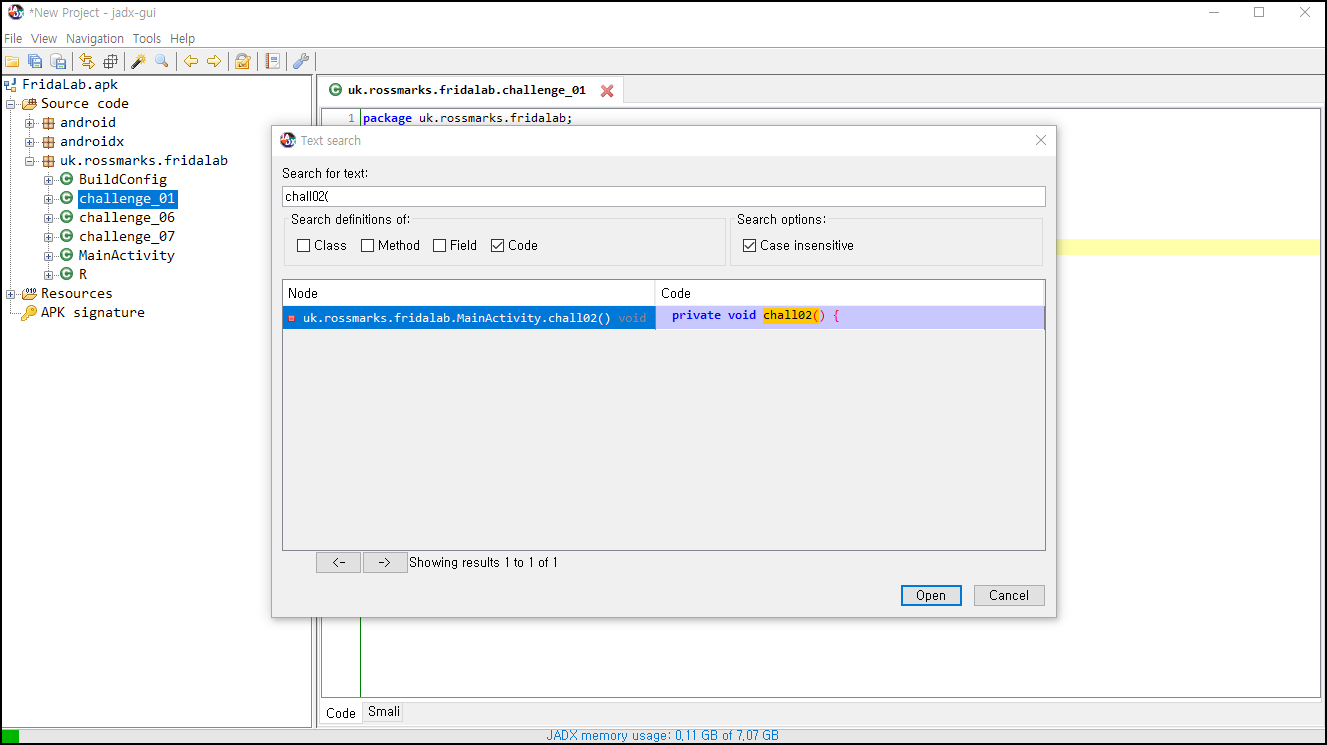jadx 프로그램을 이용해 chall02() 메소드를 찾기 위해 [Navigation] - [Text search]를 클릭하여 문자를 검색하는 기능을 사용했다. uk.rossmarks.fridalab.MainActivity.chall02() 클래스 내부에 존재하는 메소드라는 것을 알 수 있다.