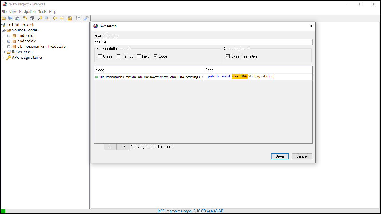 Chall04() 메소드에서 전달된 인수를 수정하는 문제를 풀기 위해 해당 함수의 위치를 Navigation -> Text search에서 메소드를 차는다.