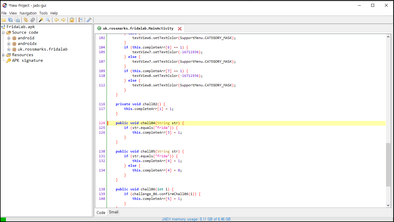 해당 메소드는 인자 값으로 string을 받고 실제로 if문에서 "frida" 문자열과 str 인자 값이 같으면 활성화해주고 있다. chall04() 메소드를 호출하면서 인자 값으로 frida 값을 동일하게 넣어주면 해당 문제가 해결되는 것 같다.