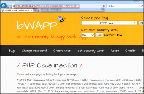 PHP에서 리눅스 명령어를 사용하기 위해 system 함수를 사용해 파일목록이 보여지는 것을 알 수 있다.