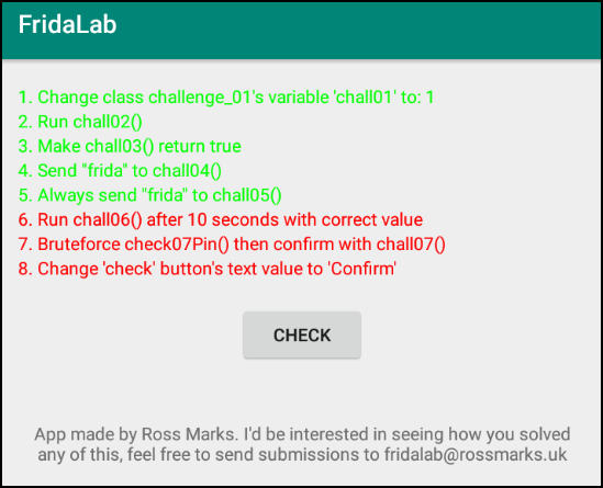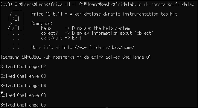 FridaLab 앱을 확인하면 5번 문제가 해결된 것을 알 수 있다.