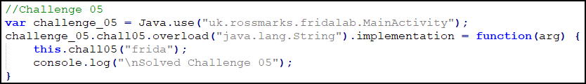 if문 안의 로직은 chall04()와 동일하다. 여기서는 else문이 추가되어 전송되지 안흥면 0으로 변경된다. 함수를 보면 한 번이라도 다르면 체크를 해제하고 있는 것을 알 수 있다. 실시간으로 [CHECK] 버튼을 클릭할 때마다 "frida" 문자열이 전달되어야 해결할 수 있다. uk.rossmarks.fridala.MainActivity 내부에 있는 chall05() 메소드를 재작성한다. this.chall05()를 사용하여 호출 시, 기준 chall05()가 가진 메소드의 행위를 수행할 수 있도록 해준다. 내부 로직은 기본 로직을 이용하고 인자 값을 "frida" 문자열 넣는다.
