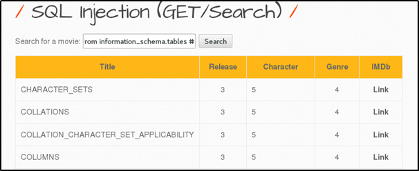 테이블 명을 확인하려고 information_schema를 사용해 데이터베이스 서버에 존재하는 모든 테이블 명을 출력한다.