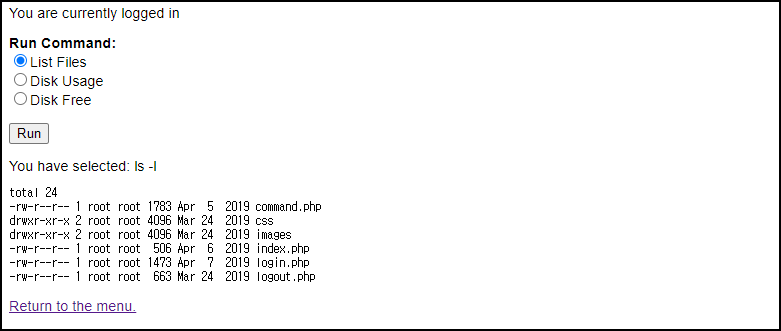 Command 클릭 후 List Files를 선택하고 Run 하면 ls -l 명령어가 동작하는 것을 알 수 있다.