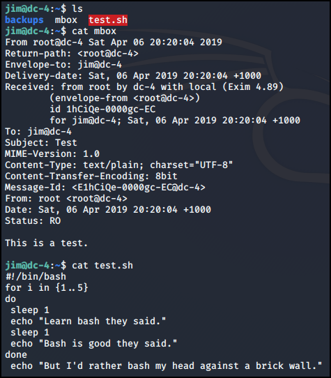 jim 폴더의 내용을 확인해보면 bakcups, mbox, test.sh 파일들을 확인했다.