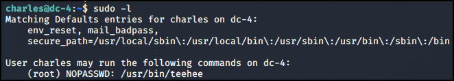 sudo -l 명령어를 통해 /usr/bin/teehee를 확인했다.