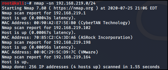 Namp을 통해 192.168.219.0/24 대역을 스캔했는 데 192.168.219.198 주소를 확인했다.