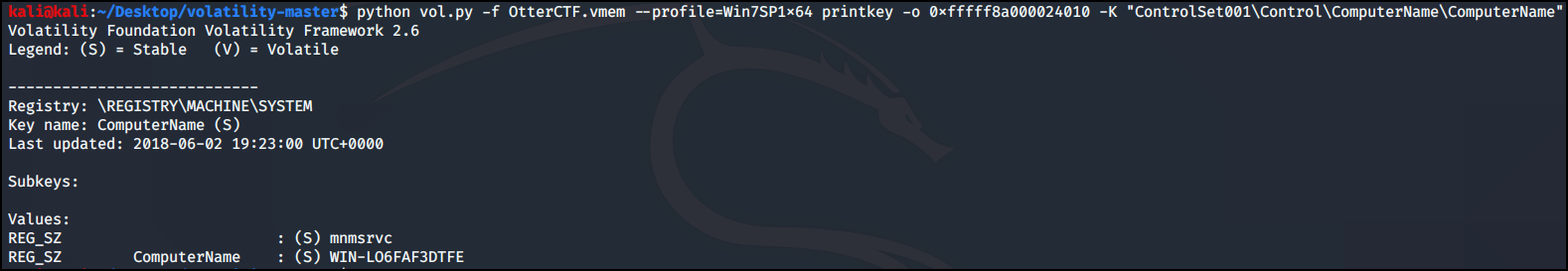 PC 이름은 HKEY_LOCAL_MACHINE\SYSTEM\ControlSet001\Control\ComputerName\ComputerName 에 들어있습니다. printkey 플러그인을 이용해서 레지스트리 키 파일 주소를 입력하고 경로를 이용해서 키값을 확인해 보겠습니다.