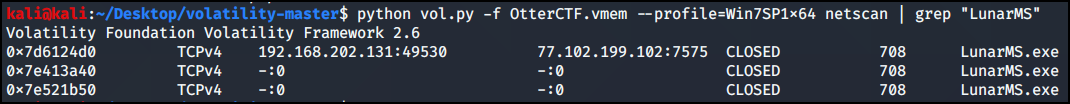어떤 프로그램을 사용하고 있는지 프로세스를 확인하기 위해 pslist 플러그인을 사용했다. 수상한 프로세스 LunarMs.exe, Rick And Morty 프로세가 수상한 것을 알 수 있다.