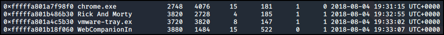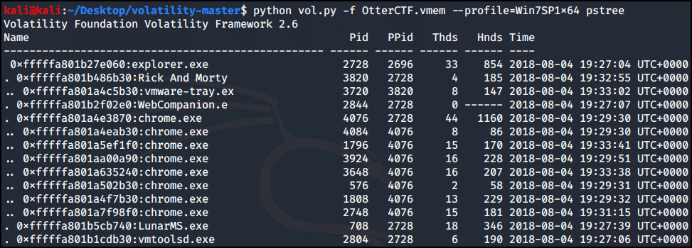 pslist를 보면 Rick And Morty 하위에 오는 프로세스인데 PPID 부모 프로세스 값이 다르다는 것을 알 수 있다.