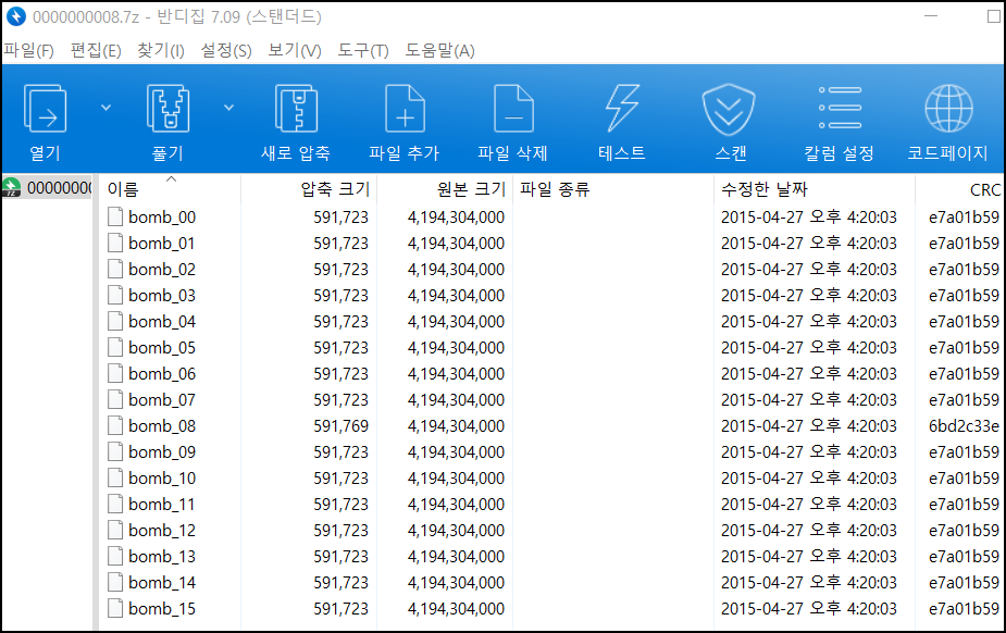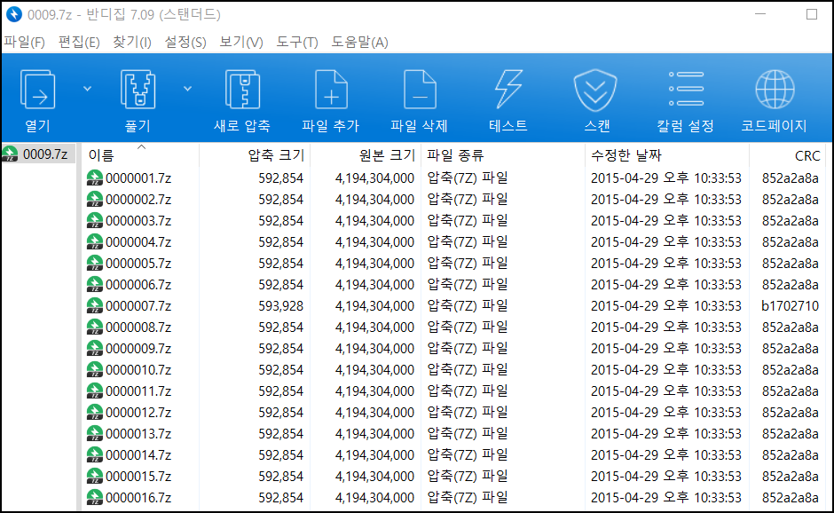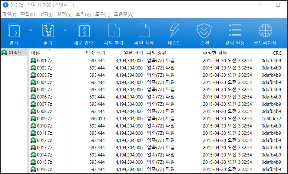 Windows로 파일을 옮긴 후 16개의 압축파일에서 동일한 용량을 확인했지만 013.7Z 압축파일만 CRC가 다른 것을 알 수 있다.