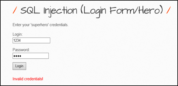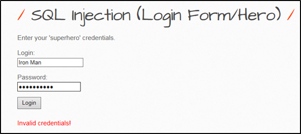Level (Medium)은 그림 1-2처럼 Iron Man ‘ or 1=1 #을 입력하면 Invalid credentials! 메시지를 보여준다.