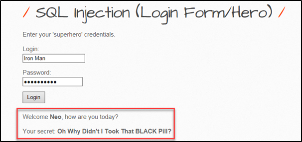 Login Iron Man, Password ‘ or 1=1 #을 입력해 Neo 계정이 보이는 것을 알 수 있다.