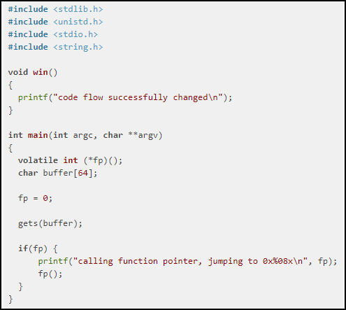 만일 fp의 값(함수의 주소 값)이 0이 아니면 "calling function pointer, jumping to fp"를 출력하고 fp() 함수를 실행한다. 만일 fp가 0이면 아무것도 실행하지 않는다. void의 return을 갖는 win() 함수를 선언한다. win() 함수는 "code flow successfully changed"라는 문자열을 출력한다.