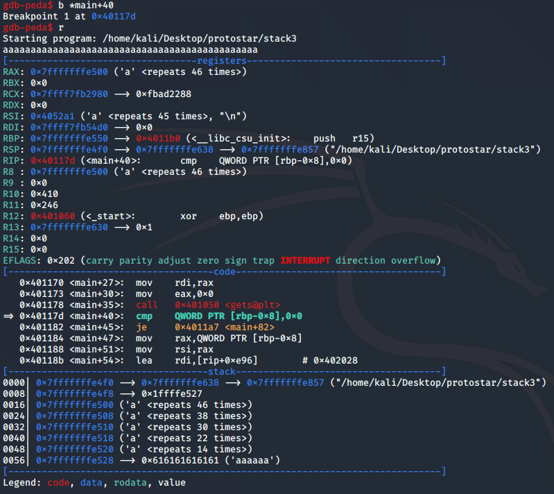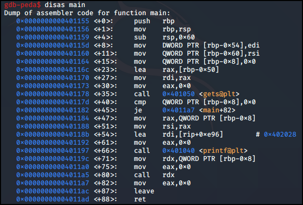 fp의 조작을 위해 우리는 72 byte의 padding을 통해 fp에 접근할 수 있고, fp를 win()의 주소("0x0000000000401142")로 덮어 쓰면 될 것 같다.