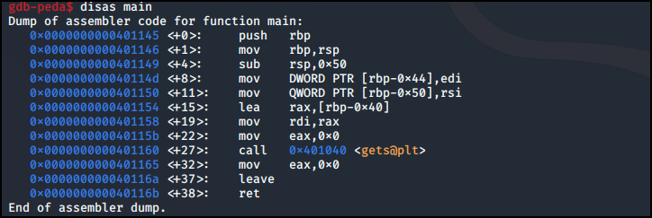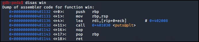 0x0000000000401132 주소가 win() 함수의 시작 주소인 것을 알 수 있다.