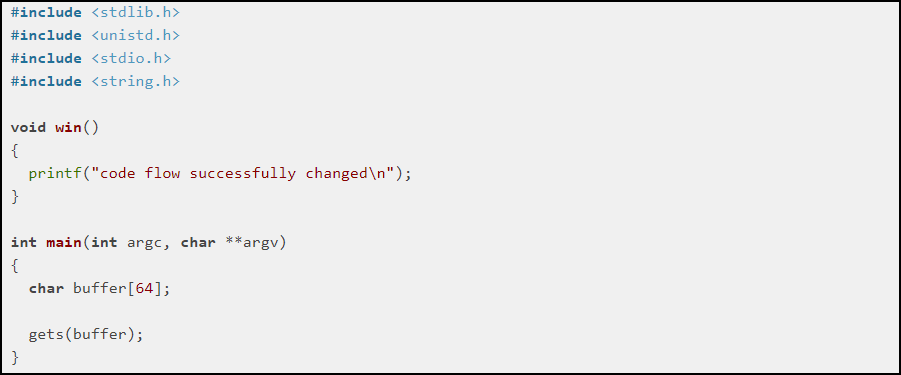 char type 64 byte array buffer를 선언한다. agets() 함수를 통해 user로부터 값을 입력받는다. win() 함수는 "code flow successfully changed\n"를 출력한다.