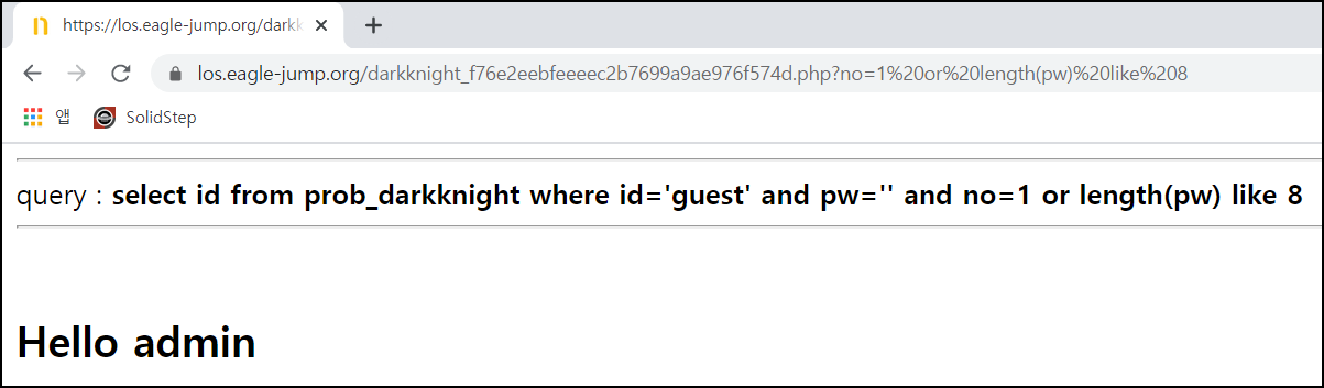 ?no=1 or length(pw) like 8 입력 시 Hello admin 메시지가 출력되는 것을 알 수 있다.