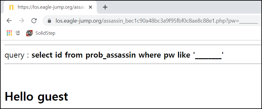_ 8개 입력 시 Hello guest가 출력이 되어 pw 길이가 8이라는 것을 알 수 있다.