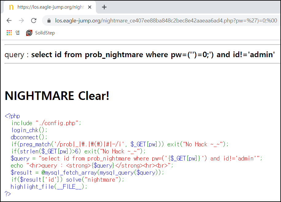 MySQL 쿼리는 ;%00 null 일 때 멈추게 되서 ?pw=%27);%00 입력 시 해결되는 것을 알 수 있다.