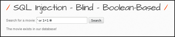 결과가 참이라는 쿼리문을 ‘ or 1=1 # 입력했는데 데이터베이스에 존재한다는 것을 알 수 있다.