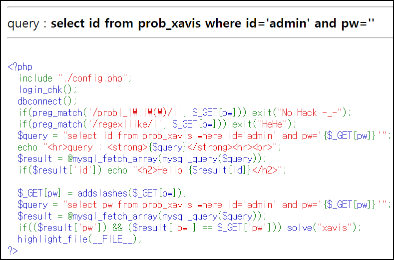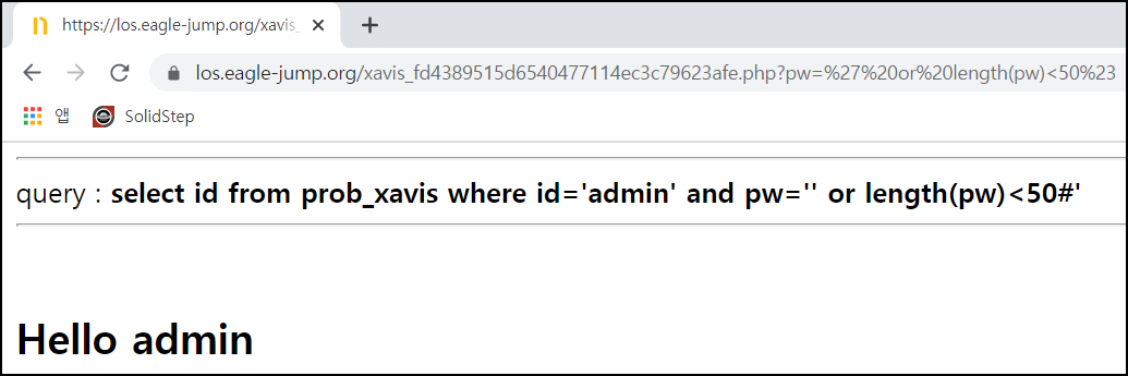 ?pw=' or length(pw)<50#을 입력 시 Hello admin 문자열을 확인할 수 있다.