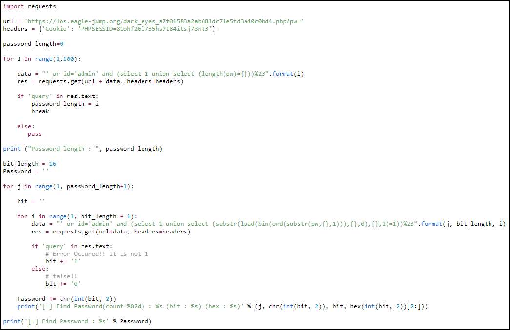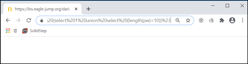 if문을 사용할 수 없게 되어 union을 이용하여 pw=' or id='admin' and (select 1 union selec 2 (length(pw)=10)) # 입력 시 빈 페이지를 보여주는 것을 알 수 있다.