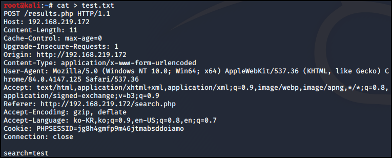 burp suite 복사한 것을 test.txt에 저장했다.