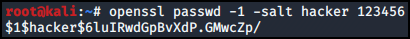 openssl 명령어를 이용해 hacker/123456 사용자의 해시값을 얻을 수 있다.