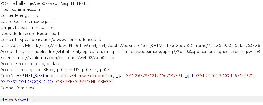 Hint 내용 처럼 id/pw 값을 같게 만들기 위해 그림 1-5처럼 test/test 변조를 시도했다.