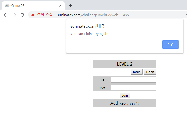 그림 1-2 test/1234 입력한 결과 "You can't join! Try again 경고창을 보여주는 것을 알 수 있다.